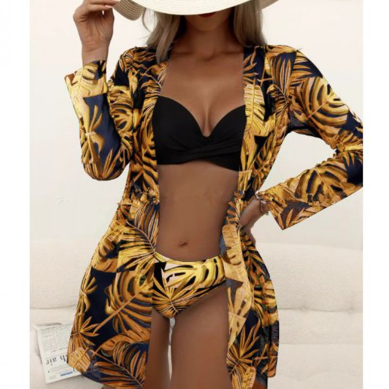 Купальник из 3 частей, арт КП1, цвет: черные и желтые листья
