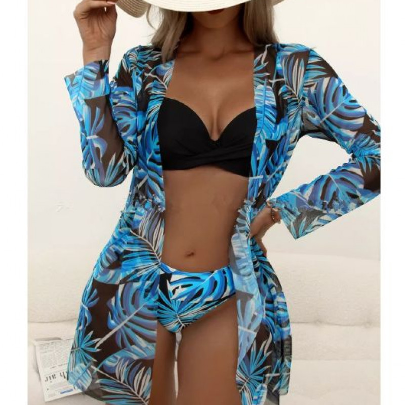 Купальник из 3 частей, арт КП1, цвет:черные и синие листья